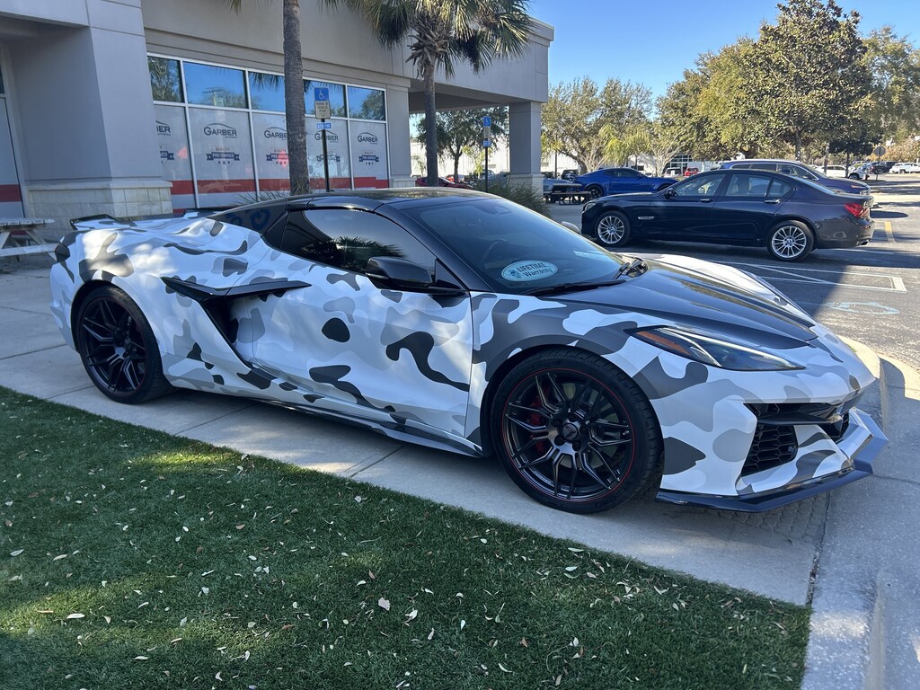 2025 Chevrolet Corvette Z06 3LZ Arctic White WINDOW TINT, Aftermarket Exhaust, White Camo Wrap, Front Splitter, Soler Throttle Controller, Uniden Radar Detector Mount and Wire Harness, 14 Speakers, 2 Cargo Nets, 4-Wheel Disc Brakes, 8-Way Power Driver Seat Adjuster, 8-Way Power Passenger Seat Adjuster, ABS brakes, Adaptive suspension, All-Weather Floor Liners w/Jake Logo (LPO), Auto High-beam Headlights, Auto-dimming door mirrors, Auto-dimming Rear-View mirror, Automatic Leveling System Headlamp Control, Automatic temperature control, Black Exhaust Tips, Bose Performance Series Sound System w/14 Speakers, Compass, Contoured Cargo Area Liners w/Jake Logo (LPO), Convertible HardTop, Convertible roof lining, Convertible Top w/Carbon Flash Nacelles & Roof, Driver Power Bolster Seat Adjuster, Edge Red-Painted Calipers, Electronic Stability Control, Emergency communication system: OnStar and Chevrolet connected services capable, Engine Specification Plaque (LPO), Exterior Parking Camera Rear, Four wheel independent suspension, Front dual zone A/C, Front Lift Adjustable Height w/Memory, Fully automatic headlights, Garage door transmitter, GT2 Bucket Seats, HD Front & Rear Vision Cameras, Heads-Up Display, Heated & Vented Driver & Passenger Seats, Heated door mirrors, Heated Steering Wheel, Illuminated entry, Leather Shift Knob, Leather steering wheel, Low tire pressure warning, Memory seat, Napa Lthr Seating Surfaces w/Perforated Inserts, Navigation System, Outside temperature display, Overhead console, Passenger Power Bolster Seat Adjuster, Performance Data & Video Recorder, Power convertible roof, Power Driver Lumbar Control Seat Adjuster, Power Passenger Lumbar Control Seat Adjuster, Power windows, Power-Adjustable Outside Heated Mirrors, Rear Cross Traffic Alert, Remote keyless entry, Security system, Side Blind Zone Alert, Speed control, Spoiler, Sport steering wheel, Steering wheel memory, Steering wheel mounted audio controls, Telescoping steering wheel, Tilt steering wheel, Universal Home Remote, Vehicle Inclination Theft Deterrent Sensor, Vehicle Interior Movement Theft Deterrent Sensor, Visible Carbon Fiber Outside Mirror Covers (LPO), Visible Carbon Fiber Sill Plates (LPO), Wheels: 20" x 10" Fr/21" x 13" Rr w/Red Stripe (LPO), Wireless Charging for Devices.