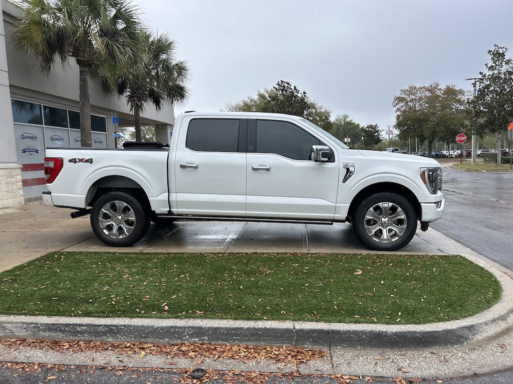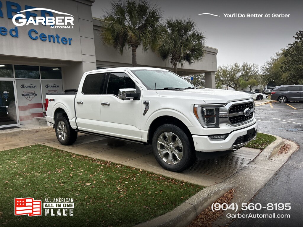 2021 Ford F-150 Platinum White Metallic 4WD, 20" Polished Aluminum Wheels, 360 Degree Camera, 4-Wheel Disc Brakes, ABS brakes, Active Park Assist 2.0, Adjustable pedals, AM/FM radio: SiriusXM with 360L, Auto High-beam Headlights, Auto tilt-away steering wheel, Auto-dimming door mirrors, Auto-dimming Rear-View mirror, Automatic temperature control, BlueCruise Hands-Free Driving, Class IV Trailer Hitch Receiver, Electronic Locking w/3.55 Axle Ratio, Electronic Stability Control, Emergency communication system: SYNC 4 911 Assist, Exterior Parking Camera Rear, Ford Co-Pilot360 Active 2.0 Package, Front Bucket Seats, Front dual zone A/C, Front fog lights, Fully automatic headlights, Garage door transmitter, Heated door mirrors, Heated front seats, Heated rear seats, Heated steering wheel, Illuminated entry, Integrated Trailer Brake Controller, Low tire pressure warning, Max Recline Driver & Passenger Seat, Memory seat, Navigation system: Connected Navigation (90-Day Trial), Outside temperature display, Passenger vanity mirror, Pedal memory, Power door mirrors, Power driver seat, Power passenger seat, Power Tailgate, Power windows, Pro Trailer Backup Assist, Radio: B&O Unleashed Sound System by Bang & Olufsen, Rain sensing wipers, Rear reading lights, Rear step bumper, Remote keyless entry, Security system, Speed control, Split folding rear seat, Steering wheel memory, Steering wheel mounted audio controls, SYNC 4 w/Enhanced Voice Recognition, Telescoping steering wheel, Tilt steering wheel, Tow Technology Package, Twin Panel Moonroof, Unique Multi-Contour Leather Bucket Seats, Ventilated front seats.