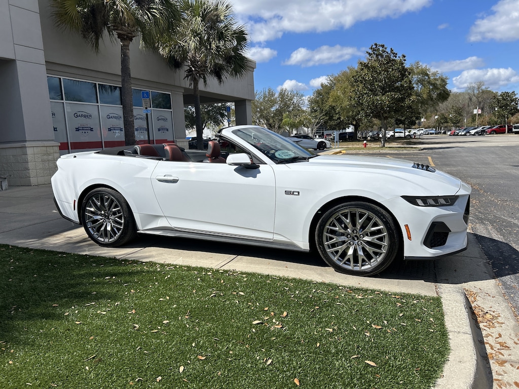 2024 Ford Mustang GT Premium Oxford White 4-Wheel Disc Brakes, ABS brakes, Active Valve Performance Exhaust, Auto High-beam Headlights, Auto-dimming Rear-View mirror, Automatic temperature control, B&O Sound System by Bang & Olufsen, Climate Controlled Heated/Cooled Front Seats, Connected Built-In Navigation, Convertible roof lining, Electronic Stability Control, Emergency communication system: 911 Assist, Exterior Parking Camera Rear, Ford Co-Pilot360 Assist+, Front Bucket Seats, Front dual zone A/C, Fully automatic headlights, Garage door transmitter, HD Radio, Heated door mirrors, Heated steering wheel, Illuminated entry, Leather Shift Knob, Leather steering wheel, Low tire pressure warning, Outside temperature display, Power convertible roof, Power door mirrors, Power driver seat, Power passenger seat, Power windows, Pre-Collision Assist w/Automatic Emergency Braking, Rain sensing wipers, Rear Parking Sensors, Remote keyless entry, Security system, SiriusXM w/360L, Speed control, Sport steering wheel, Steering wheel mounted audio controls, SYNC 4.0 QNX, Telescoping steering wheel, Tilt steering wheel, Wheels: 20" x 9" Premium-Painted Aluminum.