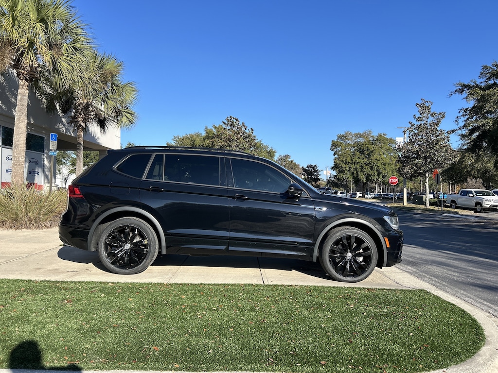 2021 Volkswagen Tiguan 2.0T SE R-Line Black Deep Black 3rd row seats: bench, 4-Wheel Disc Brakes, 4-Wheel Independent Suspension, 6 Speakers, ABS brakes, AM/FM radio: SiriusXM with 360L, Automatic temperature control, Compass, Driver vanity mirror, Emergency communication system: VW Car-Net services (capabilities require enrollment or subscription), Exterior Parking Camera Rear, Forward collision: FCW w/Autonomous Emergency Braking mitigation, Four wheel independent suspension, Front Bucket Seats, Front dual zone A/C, Front fog lights, Front reading lights, Fully automatic headlights, Heated door mirrors, Heated Front Comfort Seats, Illuminated entry, Leather Shift Knob, Leather steering wheel, Low tire pressure warning, Outside temperature display, Overhead console, Passenger vanity mirror, Perforated V-Tex Leatherette Seating Surfaces, Power door mirrors, Power driver seat, Power moonroof, Power windows, Radio: MIB3 Composition Media AM/FM/HD, Rear reading lights, Remote keyless entry, Security system, Speed control, Split folding rear seat, Sport steering wheel, Steering wheel mounted audio controls, Telescoping steering wheel, Tilt steering wheel, Wheels: 20" Machined Black Alloy.